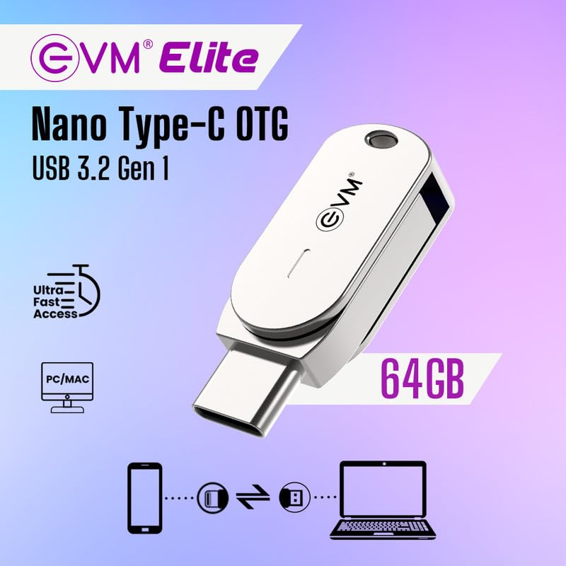 EVM Nano Type C OTG USB 3.1 Gen 1: the ultimate solution for ultra-fast data access and universal compatibility. With a lightning-fast read speed of 100 MB/s and a write speed of 30 MB/s, this OTG drive is engineered for the swift transfer of files, photos, videos, and more. Its Type C connector makes it a perfect match for a broad spectrum of devices, ensuring you can connect with ease, regardless of whether you’re using the newest gadgets or older models.